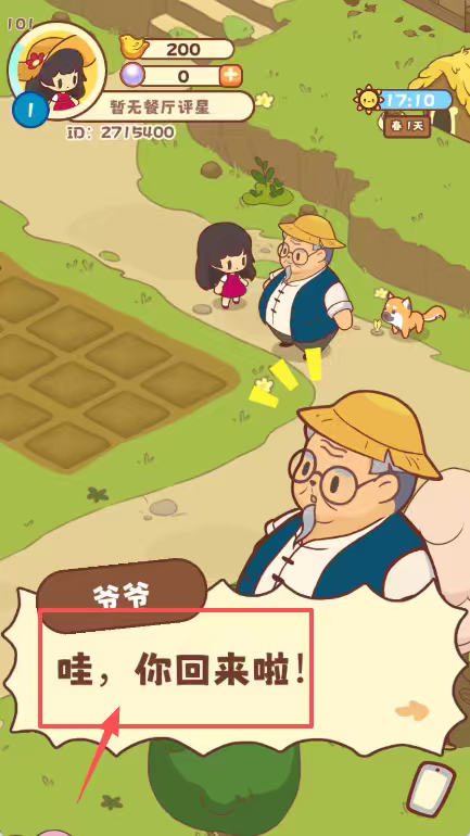 2、点右下角戴草帽爷爷,触发爷爷打招呼对话,查看左上角玩家信息。