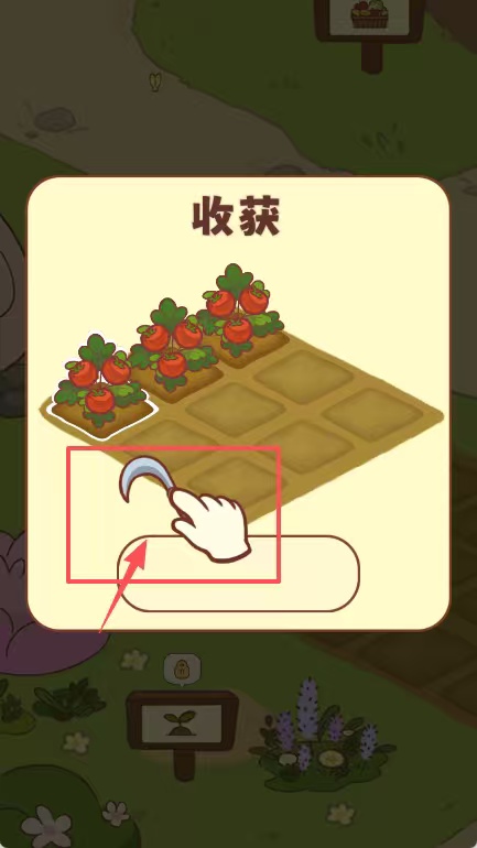 4、点弹窗里被红框圈出的镰刀图标,收割九宫格土地里已成熟的红色番茄。