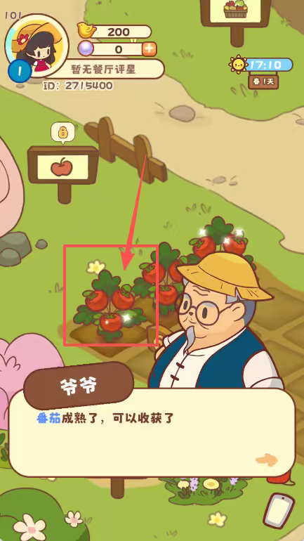 3、点爷爷旁边提示番茄成熟的牌子,再点左下角番茄地,准备收获番茄。