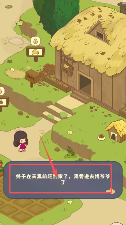 1、小女孩在木屋前,点红色箭头指向的对话框,触发回家找爷爷的剧情。