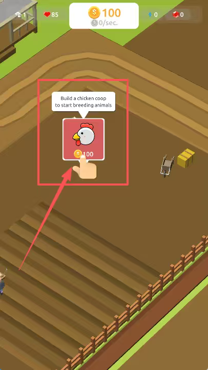 1、看农田画面,提示花100金币建鸡舍养鸡,手推车和箱子旁有购买指引,上方显示爱心85、金币100。