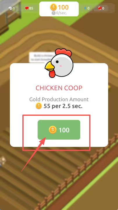 2、在鸡舍购买窗口,花100金币买鸡舍,每2.5秒产55金币,绿色按钮和箭头提示购买。