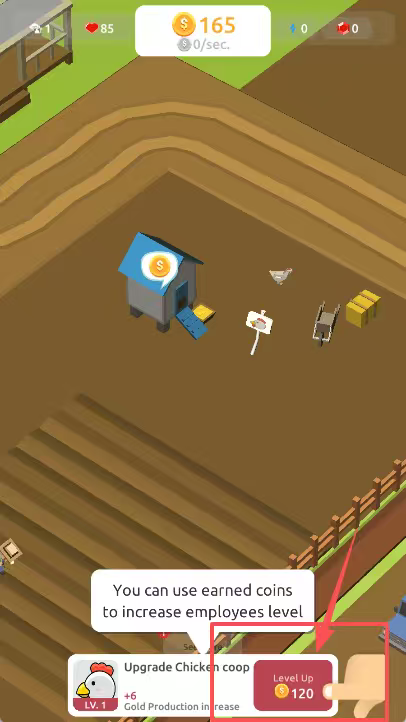 4、农田背景画面,用165金币升级1级鸡舍,花120金币可提升产量,提示金币能升级员工等级。