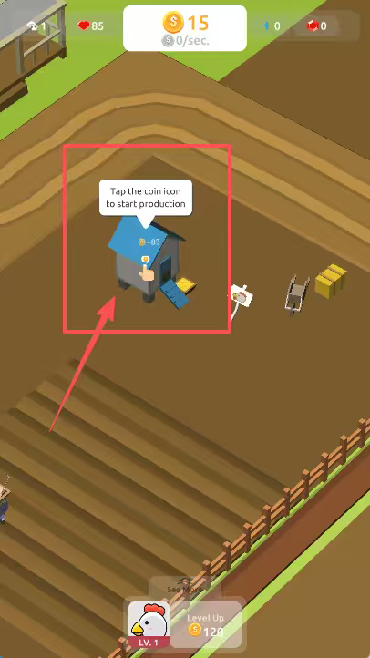 3、俯瞰农场,点中央带金币图标的小屋开始生产,左上角显示爱心85、金币15,等级LV.1需120金币升级。