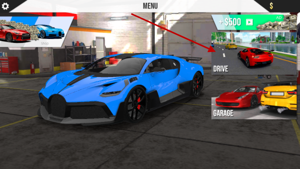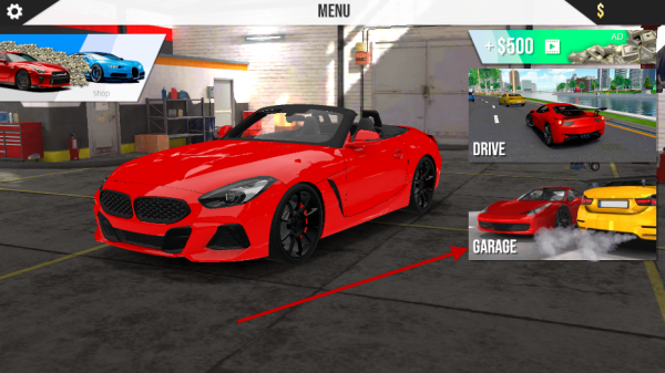 1、回到游戏的主界面,点击屏幕右侧的GARAGE按键打开车库。