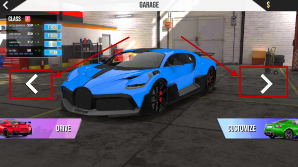 2、接着我们可以点击屏幕左右两侧的箭头按键来切换不同的赛车。