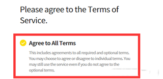 4、点击黄色按钮后,新页面会让我们勾选各种用户条款,直接选择第一个同意所有条款,点击下一步就可以了