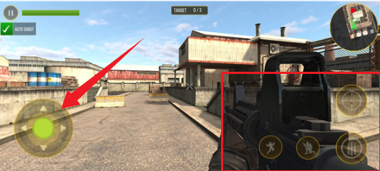 5、正式进入游戏界面,我们可以看到左侧的摇杆是控制玩家前进后退的,右侧则是跳跃、下蹲、射击和瞄准;
