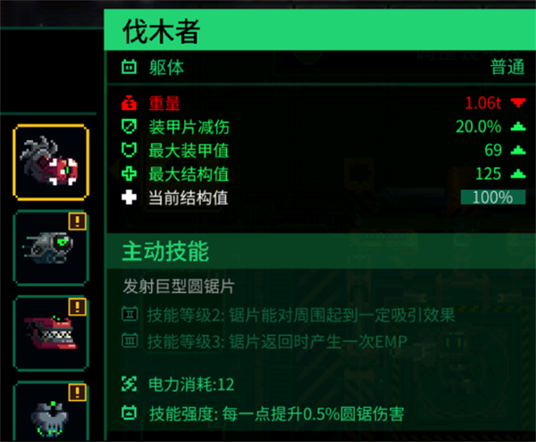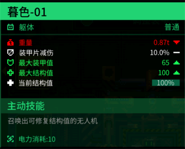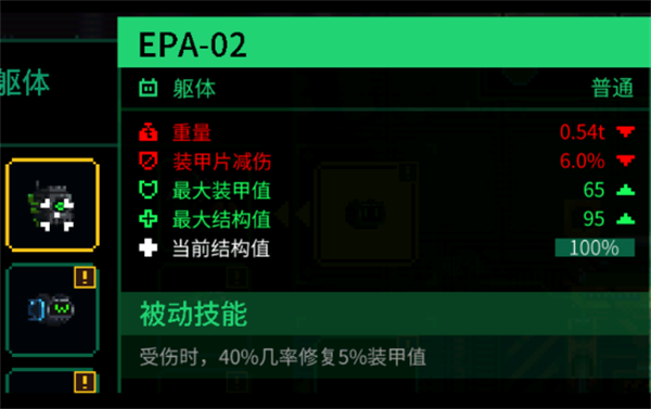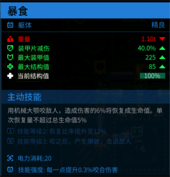 三个关于躯体的内容说完后,接下来要进入第二阶段,那就是躯体的选择。因为游戏里的躯体(其实不只是躯体,其他模块同理)是五花八门的,比如说这款减伤、血甲都低,但是有能够回血的技能。