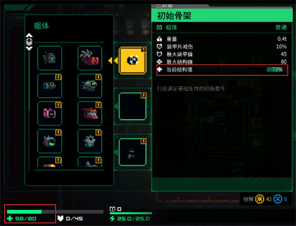 通过上述介绍,相信大家脑海里已经有结构值=血量这个概念了。那么当前结构值的意思,就是当前你机器人的百分比血量,如下图,最大结构值*当前结构值=数字血量,即73%*80=58.4,四舍五入为58。