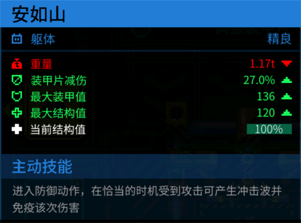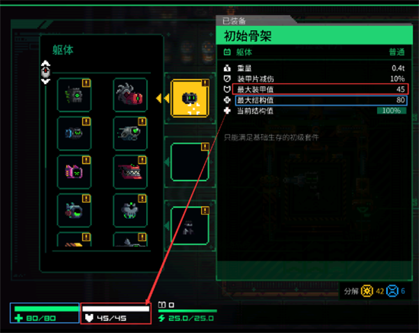 结构值=血量最大=最多能有多少的护甲和多少的血量如下图所示,最大装甲值为45,对应左下角就是45的甲;最大结构值80,对应左下角就是80的血。