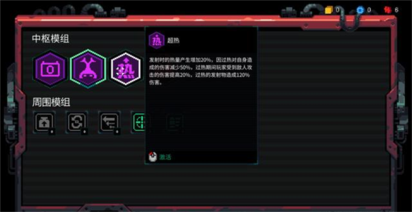 「中枢模组」与「周围模组」不同,对于机甲的基础提升有不同的方向,建议玩家通过自己的战斗风格选择适合的「中枢模组」。例如对输出有要求的玩家可以选择超热模组,战斗力会倍增,但缺点也是容易过热。