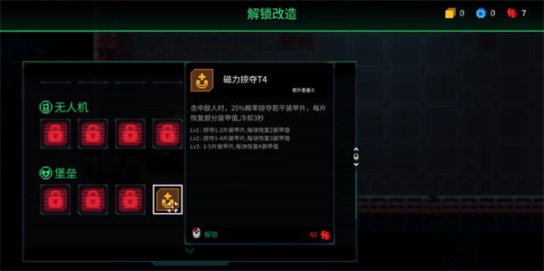 「红色素材」作为游戏中最宝贵的素材,玩家在每局战斗后都会少量获得,且只能再基地界面使用。主要是用来提升「中枢模组」、「周围模组」、「解锁改造」、「解锁装备」这四个方面。