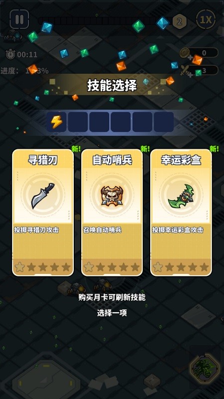 3、消灭敌人之后就会掉落绿色能量,捡取会增加经验值,经验值满了之后就可以选择技能了。